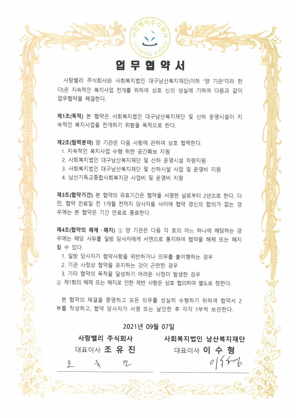 지난 9월 7일 IT전문법인 ‘사랑밸리 주식회사’(대표 조유진)와 우리 대구남산복지재단(대표 이수형)은 업무협약을 체결했다. 이번 업무협약을 통해 사랑밸리는 2021년 9월부터 일시적 및 정기적으로 대구남산복지재단과 산하시설의 지속적인 목적사업 수행을 위해 적극적으로 협조해주기로 약속하였다. |