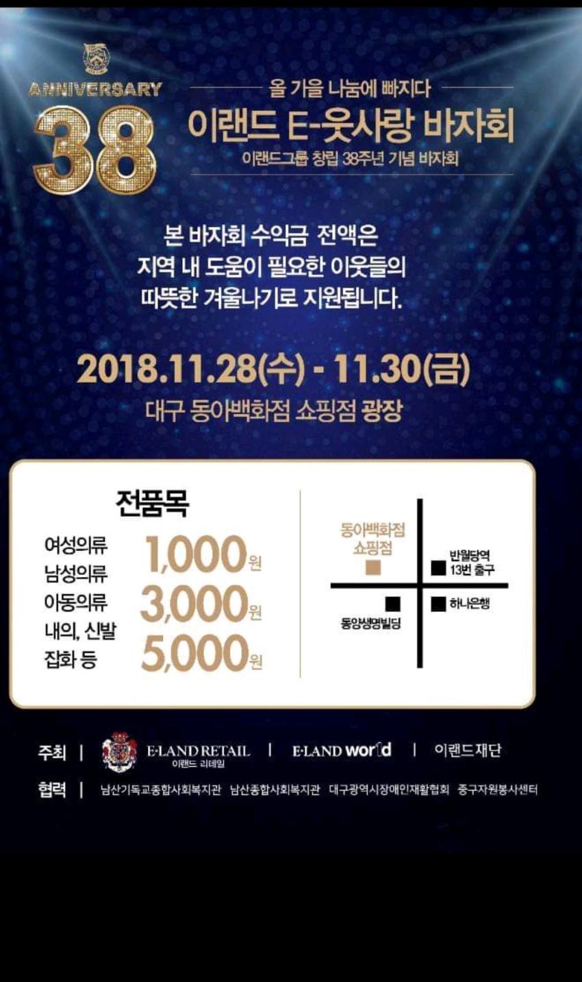 이랜드 E-웃사랑 바자회 이랜드그륩 창립 38주년을 기념하여 남산기독교종합사회복지관, 남산종합사회복지관, 대구광역시장애인재활협회, 중구자원봉사센터와 협력하여 11월 28일(수) ~ 11월 30일(금) 11시 30분 ~ 16시까지 대구 동아백화점 쇼핑점 광장에서 바자회가 개최됩니다. 본 바자회의 수익금 전액은 지역 내 도움이 필요한 이웃들의 따뜻한 겨울나기로 지원되오니 많은 참석 부탁드립니다~ |