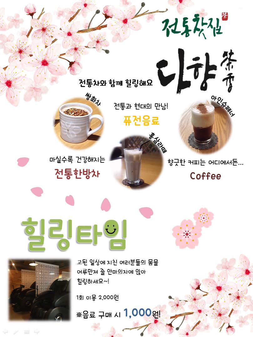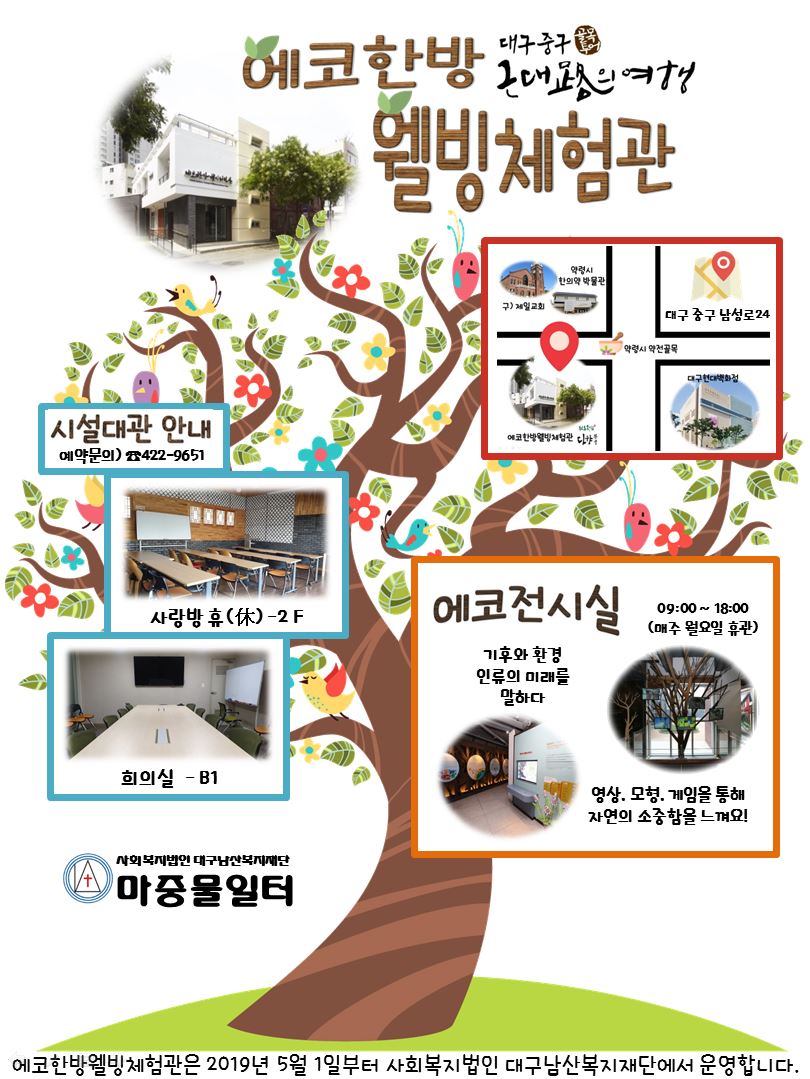 한약향기가 은은하게 퍼지는 대구 약령시에 위치한 에코한방웰빙체험관 다향은 전통차를 마실 수 있는 공간뿐만 아니라 친환경 체험시설 에코한방웰빙체험관이 있는데요, 1층에는 지구와 환경, 에너지절약에 대해 생각해보는 에코전시실과 2층은 심신의 피로와 스트레스를 치유하는 최신식 안마의자가 구비되어 있는 힐링 타임 공간이 준비되어 있습니다. 힐링하러 많이많이 놀러오세요~ |