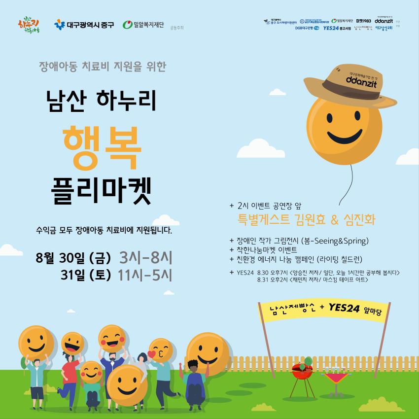 '남산하누리 행복 플리마켓'에서 여러분들을 초대합니다! 장애아동 치료비를 마련하고자 남산기독교종합사회복지관, 대구광역시 중구도시재생지원센터, 밀알복지재단이 협력하여 8월 30일(금) 15:00~20:00, ~ 8월 31일(토) 11:00~17:00시 까지 남산제빵소+YES24 앞 마당에서 '남산하누리 행복 플리마켓'이 열립니다.