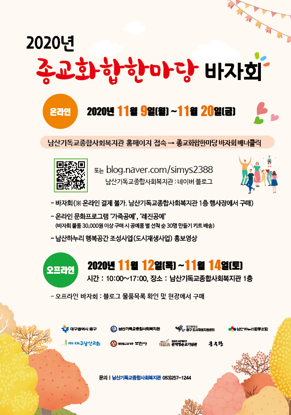 < 2020년 종교화합한마당 바자회 > 다양한 종교기관과 주민들의 화합의 장을 마련하고자 "2020년 종교화합한마당 바자회"를 실시합니다. 아래 내용을 참고하시어 온라인, 오프라인 바자회에 많은 관심과 참여부탁드립니다♥ |