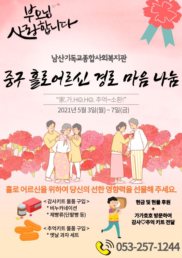 5월, 가정의 달을 맞아 복지관에서 어르신들을 위한 경로행사를(물품 전달) 실시하고자 합니다. 현금 및 현물로 따뜻한 마음을 모아주세요. 여러분들의 많은 관심과 연락 부탁드립니다♥ |